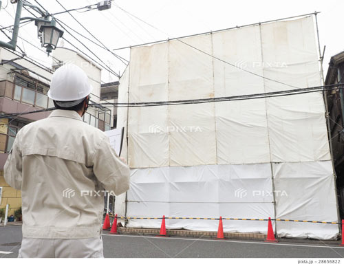| 解体工事における振動や粉塵、騒音などの近隣に対する配慮を第一に施工を行います。施工の際には頑丈な足場を組み、防音性のシートを用いたコンクリート解体専用のパネルを周囲に設置いたします。 |