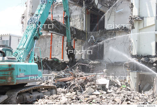 | 近隣への環境対策と内装解体工事が終わったのち、重機による建物の解体工事を行います。 |